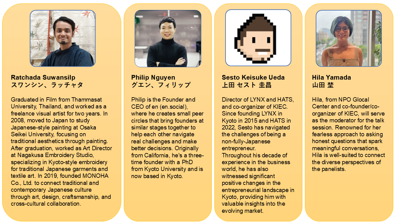 本イベントでは、京都で実際に起業した外国人起業家が、起業の過程で直面した課題や、そこから得た学びなど、リアルな経験を共有します。また、トークセッションおよびネットワーキングの時間も設けています。