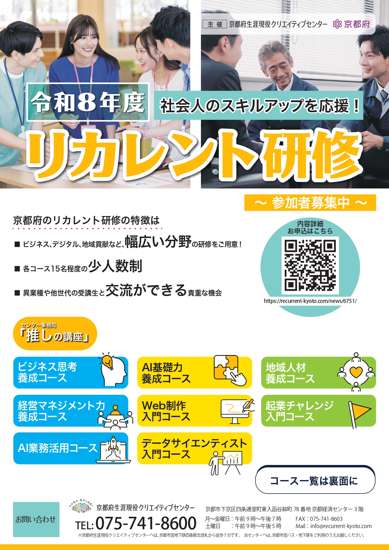 京都府生涯現役クリエイティブセンターでは、皆様のスキルアップ・キャリアチェンジをサポートする「リカレント研修」を開講します!