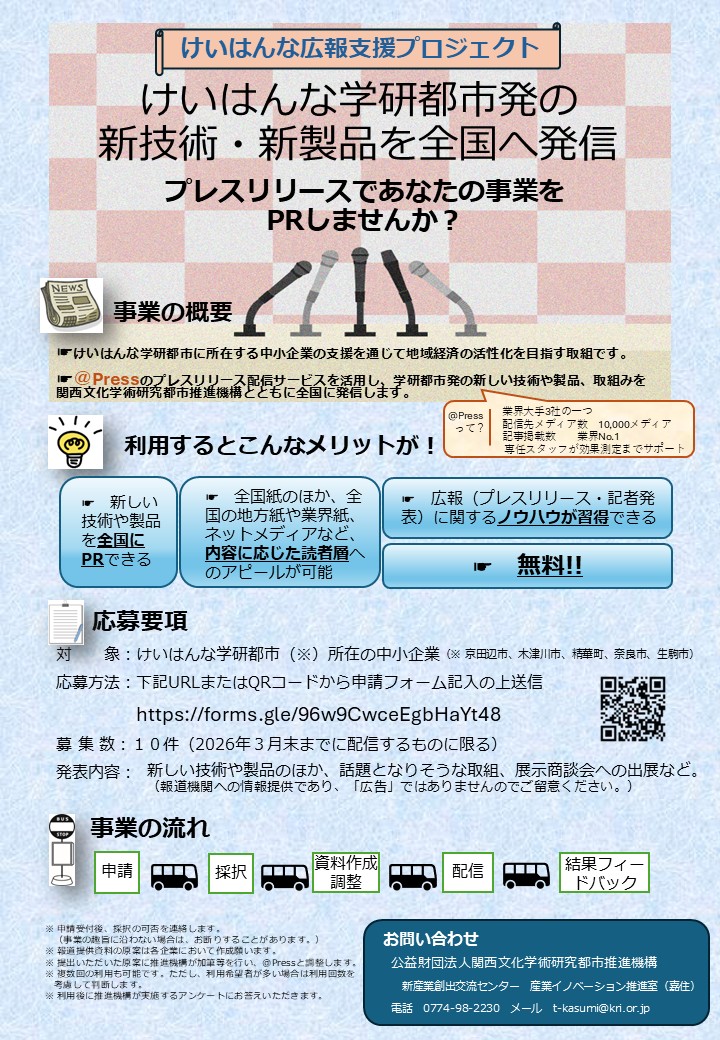 ・この事業はけいはんな学研都市に所在する中小企業等に、報道機関への情報提供の機会を設けるとともに、広報に関するノウハウを習得していただくことを目的としています。